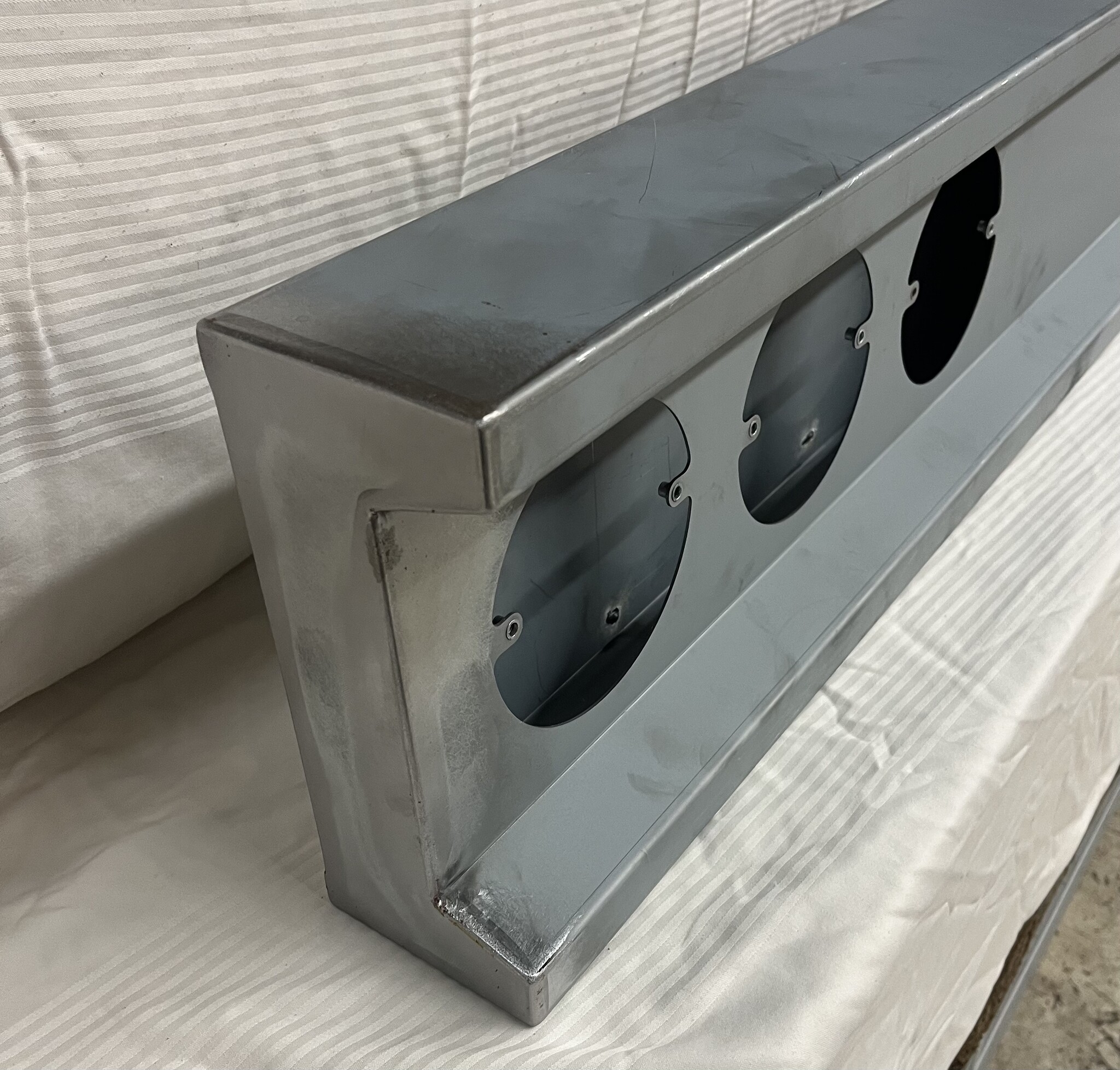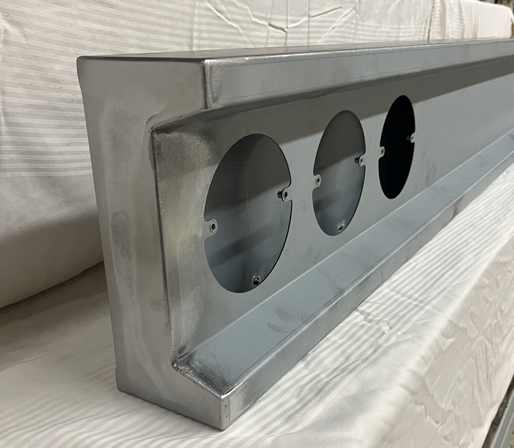 lichtbalk voor montage achter de cabine 1900mm lang 270mm hoog 110mm dik. geschikt voor montage van ronde 140mm lampen. Lampen niet inbegrepen. materiaal zincor staal onbehandeld. Zincor is een veelgebruikte staalplaat die wordt toegepast in de automotive om roest tegen te gaan.